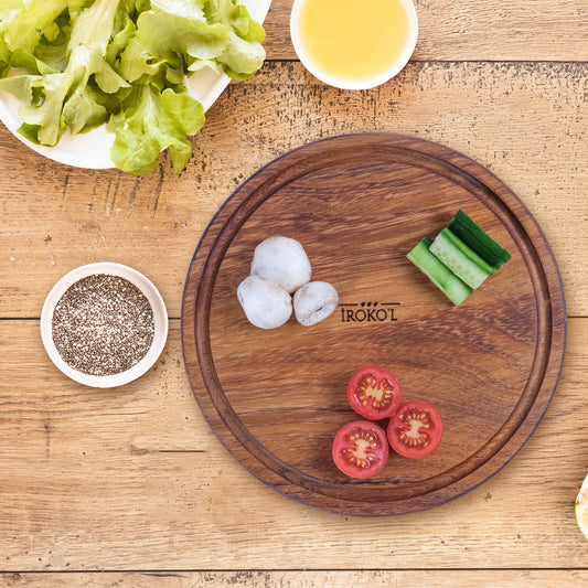 İROKO’L Yuvarlak İroko Ağacı Ahşap Sunum & Kesme Tahtası – 25x25 cm | Oluklu, Gıdaya Uygun